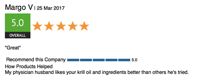 "Just received my lab results since taking krill oil. Amazing results! My doc told me everything was within normal limits. I thought he made a mistake, so I went to records to retrieve a copy, I had to see it for myself: CHL: 185/Tri: 86/HDL: 66.